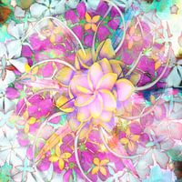 Abstracte bloemen mandala in frisse pastel tinten met een frangipani (oftewel plumeria) in het midden.