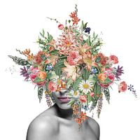 Portret van vrouw, samengesteld uit een foto en uit diverse illustraties van bloemen.