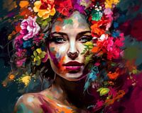 Vrolijk kleurrijk abstract portret van een vrouw met bloemen.