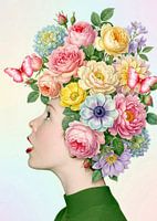 Dit kunstwerk is een surrealistisch portret van een jonge vrouw, met een kapsel van levendige, bloemen.