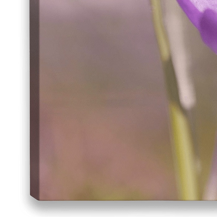 A close-up van bloeiende paarse krokus tegen een pastelkleurige achtergrond.