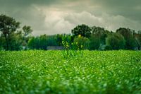 Veldbloemen die uit het hoge gras willen ontsnappen terwijl er een onweer nadert.