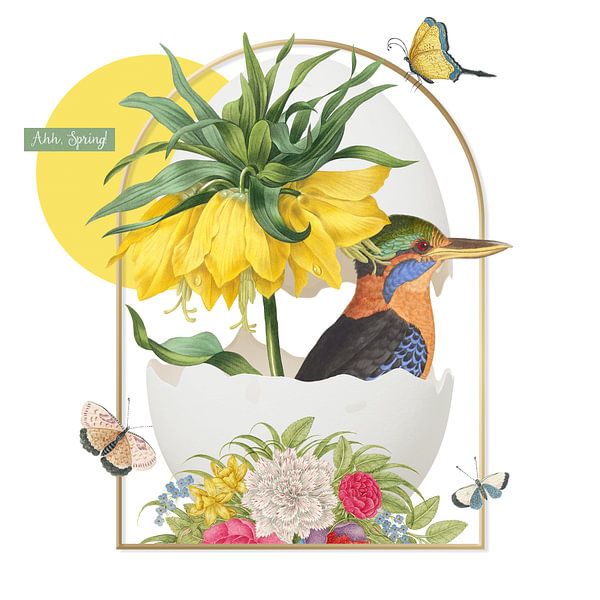 Een charmant en gedetailleerd kunstwerk, vol met lente. . De afbeelding toont een gele keizerskroon (Fritillaria imperialis) en een kleurrijke ijsvogel in een gebroken ei, omringd door kleinere bloemen en vlinders. De stijl doet denken aan klassieke botanische…