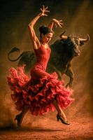 De stier op de achtergrond lijkt een schimmig wezen - krachtig, wild, maar niet dominant. Hij lijkt eerder deel uit te maken van haar beweging, alsof hij geboren is uit de energie van haar dans. Het stof dat rond haar voeten speelt is niet alleen atmosferisch - het lijkt de zichtbare echo van de passie die deze scène draagt.
