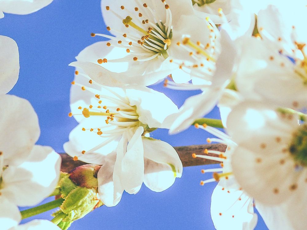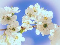 Een close-up van witte Prunus, kersenbloesem tegen een blauwe lente lucht