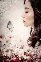 combinatie van meerdere beelden voor een heerlijk lentegevoel. Zomerbloemen, bloesem, en vlinder en een prachtig model dat serene rust uitstraald. Verkrijgbaar in meerder tinten.