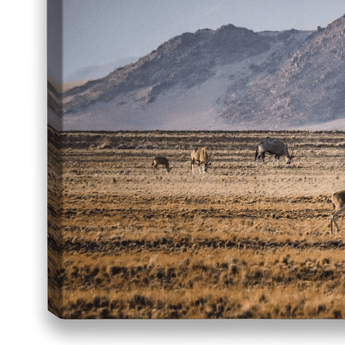 Fantastisch landschap in de Sossusvlei van Namibië (Afrika). Het was een adembenemend gezicht om de antilopen (Springbokkies in het Zuid-Afrikaans) op deze manier te fotograferen. De bergen op de achtergrond brengen een mooie diepte in de foto.