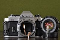 Modelbouw figuren zijn bezig met de grote schoonmaak van een analoge Nikon FG. Door gebruik te maken van deze kleine figuren krijg je een vervreemdend effect in de foto.