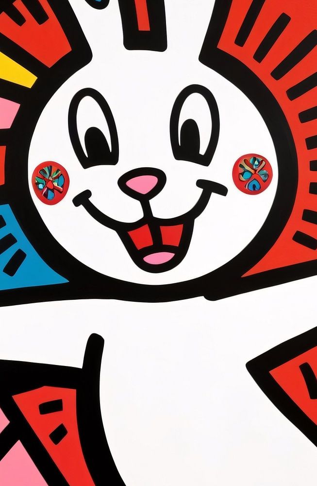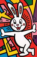 Dit vrolijke en speelse kunstwerk toont een dansend konijn omringd door felle, levendige kleuren en patronen. De cartoonachtige stijl geeft het werk een vrolijke en energieke uitstraling die meteen de aandacht trekt. Het konijn, met kleurrijke details in de oren en wangen, lijkt vol leven en beweging te zitten, perfect passend bij een moderne, jeugdige sfeer. Dit kunstwerk zou geweldig staan in een kantoor of slaapkamer, waar het leven en kleur kan brengen aan de ruimte. Met zijn opvallende lijnen en dynamische achtergrond zorgt dit stuk voor een vrolijke en positieve sfeer, waar je elke dag weer een glimlach van krijgt.