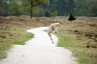 Springend lammetje in de lente ergens op een schelpenpaadje in Nationaal Park Drents-Friese Wold.