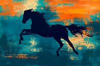 Een krachtig, zwart paardensilhouet breekt door levendige, turquoise en oranje penseelstreken die dynamiek en vrijheid uitstralen. Dit energieke kunstwerk roept een gevoel van beweging en natuur op. Ideaal voor een woonkamer of kantoor om een inspirerend en levendig accent te creëren dat de zintuigen prikkelt en de kamer tot leven brengt.