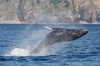 Springende bultrug walvis in Alaska, komt met bijna zijn hele lichaam uit het zeewater