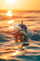 Een glinsterende zonsondergang baadt de golven in warm licht, terwijl een elegante dolfijn speels door het water glijdt. Dit tafereel straalt rust en vrijheid uit en verbindt de kijker met de ongerepte natuur. Perfect voor de woonkamer, het creëert een ontspannen sfeer en nodigt uit om te dromen.