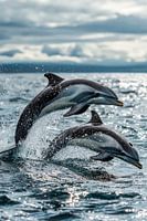 Twee elegante dolfijnen breken met energieke sprongen door het wateroppervlak, gevangen in een fascinerend spel van licht en schaduw. Het bewegende decor straalt levensvreugde en dynamiek uit, ideaal voor een woonkamer die een maritieme uitstraling wil uitstralen. Hier versmelt de rust van de oceaan met de levendigheid van de natuur.