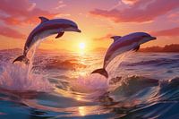 springende dolfijnen in de zee bij zonsondergang, water, tandwalvissen, zeedieren, digitale kunst, surrealistisch