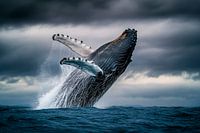 Een enorme walvis breekt majestueus door het wateroppervlak, zijn machtige vinnen lijken wel levende vleugels. Omgeven door dramatische, donkere wolken wordt de kracht van de oceaan weerspiegeld. Dit indrukwekkende moment vangt de ongebreidelde vrijheid en gratie van de zeereus terwijl hij verandert in een dans van spetters en licht.