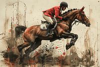 Dynamisch beeld van een springruiter in volle actie op een bruin paard tijdens een show.