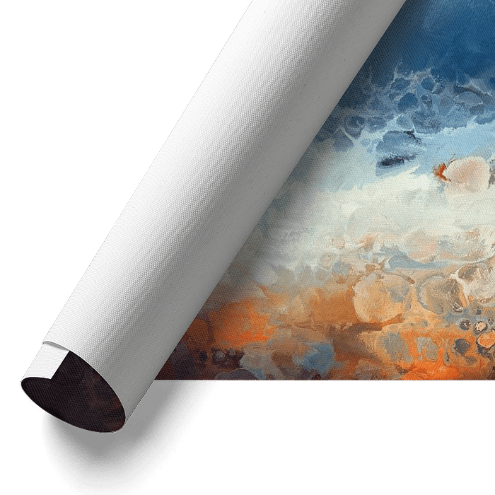 Een mix van warme en koele kleuren smelt samen en creëert een impressionistisch zeegezicht. Vette streken rood, oranje en blauw roepen een gevoel van beweging en stroming op.
