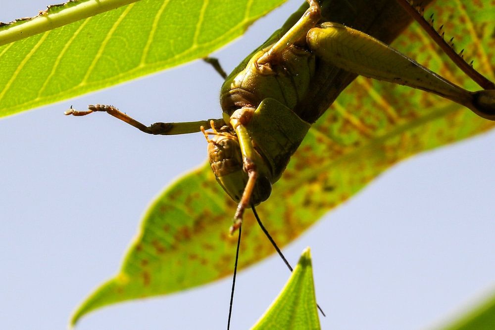 Deze sprinkhaan was erg traag. Hij bleef urenlang zitten zonder noemenswaardige beweging. Uiteindelijk klom hij naar dit blad en ging er ondersteboven aan hangen alsof hij aan het turnen was.