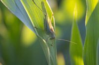 Een sprinkhaan doet zich tegoed aan een lekker maisblad.