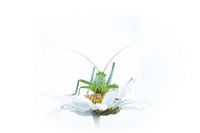 Deze sprinkhaan zat nog op te warmen op een vroege zomerochtend. Door de witte achtergrond is dit een foto die aan de muur erg goed zal uit komen.