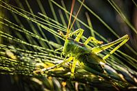 Een sprinkhaan op korenhalmen warmt zich in de zonlicht.