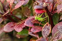 Een sprinkhaan bedekt met dauw op een rode haag.