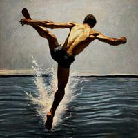 Het schilderij met de titel "Leap of Joy" toont een man in zwembroek, gevangen in de lucht terwijl hij door kristalhelder water springt. Zijn linkerbeen strekt zich omhoog naar de grenzeloze hemel, terwijl zijn rechterbeen lichtjes over het wateroppervlak glijdt, waardoor rimpelingen ontstaan die de serene stilte doorbreken. De kunstenaar gebruikt een palet dat gedomineerd wordt door blauw en wit, wat een gevoel van kalmte en zuiverheid oproept.