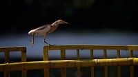 Een Javaanse Ralreiger die een sprongetje maakt op het hek om de vijver, in een park in Noord Jakarta, Indonesie.
