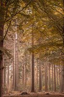 Warme herfstkleuren in deze sprookjesachtige foto in het bos op de Woldberg (Overijssel) tijdens de herfst. De lange dunne bomen, scherptediepte en de kleuren geven het geheel een mysterieuze sfeer.