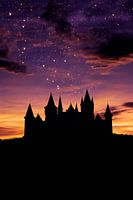 Dompel jezelf onder in de mystieke sfeer van een silhouet van een majestueus kasteel, omringd door een dieppaarse nachthemel en fonkelende sterren. Deze mysterieuze scène ontvouwt een vleugje magie en avontuur en is perfect voor een slaapkamer of een creatief kantoor waar dromen en inspiratie hun plek vinden.
