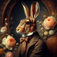 Een portret van een sprookjesachtig konijn, omringd door de natuur vol bloemen. Het digitale kunstwerk is gemaakt in de stijl van een klassiek schilderij. Voor een magische toevoeging aan je interieur, waar je bij wilt wegdromen.