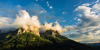 Een fenomenaal uitzicht over de berg welke omhuld zijn door wolken. Deze berg is onderdeel van de Dolomieten in Italië.