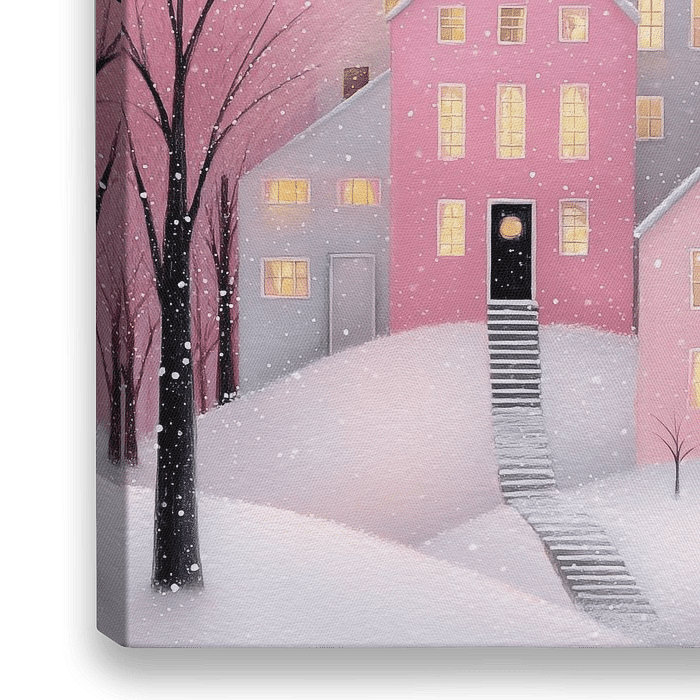Illustratie van een sprookjesachtig winterlandschap, met huisjes, bomen en sneeuwval in voornamelijk roze tinten.