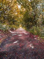 Een pad die leidt naar een witte mist. Het heeft een fantasie achtige uitstraling met aparte kleuren.