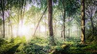 Zonsopgang in het Gremberg bos. Op de voorgrond twee grote beuken en een verweerde, met mos begroeide boomstam. De foto is in de zomer genomen. Het is een gedeelte van een 360 graden panorama.