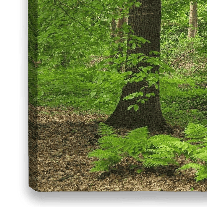 Een foto van een prachtig, groen bos in het voorjaar. Ik heb de foto zo genomen dat je in het donkere gedeelte kijkt. De schaduwzijde van het beukenbos. Links, op de voorgrond staan een paar varens in het lichtere gedeelte. Helemaal in de verte is het weer lichter. Zo krijg je drie lagen in 1 beeld.