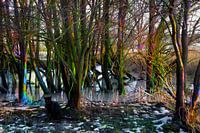Ina Hölzel fotografie en bewerking. Op een plek in het bos in de Oostvaardersplassen kwam ik deze bomen tegen die in het water stonden. Een apart gezicht. Bij veel regen staat dit stuk bos onder water. Deze foto moest ik wat mee doen. Het nodigde me uit om mijn fantasie op los te laten en er een kleurig sprookjesbos van te maken alsof…
