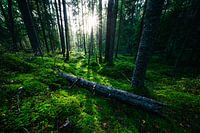 Deze foto is gemaakt tijdens een wandeling in Nationaal Park Tiveden in Zweden. Het nationaal park bestaat voornamelijk uit oud bos, meren en rotsen. De zonnestralen door de bomen en het helder groene mos geven dit deel van het bos een sprookjesachtige uitstraling. Je kreeg bijna de nijging om te gaan zoeken naar de elfjes en kaboutertje.