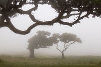 De laurierbomen zijn wazig te zien door de mist die door het heuvellandschap trekt van het bloemeneiland.