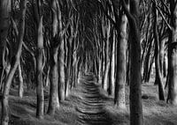 Zwart-witfoto van het sprookjesbos / sprookjesbos op het eiland Rügen. Een smal pad loopt door de bomen, bizar gevormd door de wind. Zonlicht overspoelt de boomstammen in de herfst.