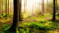 Idyllische zonsopgang in het bos met felle zonnestralen in de mist.