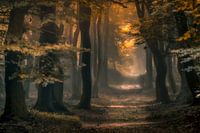 Het eerste licht schijnt door de bomen in het Speulderbos op de Veluwe. De herfst doet zijn intrede en de bladeren kleuren goudgeel.