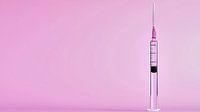 Illustratie van een staande spuit op een zachtroze achtergrond, die concepten als gezondheid, medicijnen en immunisatie weergeeft. De minimalistische illustratie benadrukt het belang van medische zorg en preventie en is ideaal voor gezondheidscampagnes of medische onderwerpen.