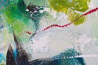 Een abstract beeld dat ruimte geeft om eigen beleving bij te hebben. De koele kleuren vormen een achtergrond bij het krachtige rode accent dat in een diagonaal de beeldlijn versterkt.