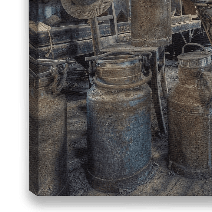 Een oude antieke kinderwagen en melkbussen op een zolder in een vervallen en verlaten huis.