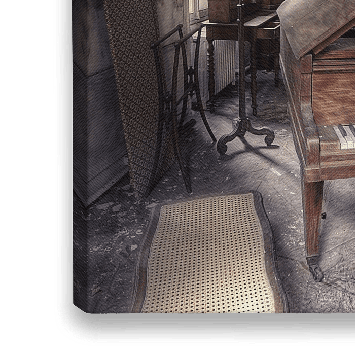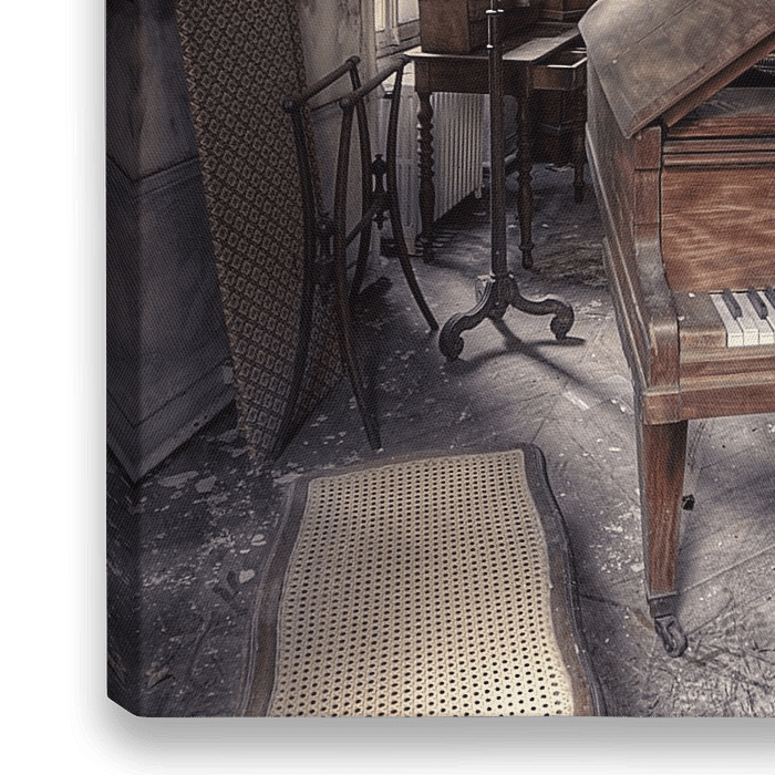 Een mooie oude piano is een compleet ingericht en verlaten kasteel.