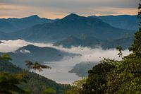 Zonsopkomst in de Knuckles Mountain Range in Sri Lanka. In de vroege ochtend hangt er een mistlaag in het dal boven het meer en de rivier.