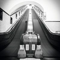 Deze indrukwekkende zwart-witfoto van de iconische houten roltrap in de St.-Anna Tunnel (Sint-Annatunnel) in Antwerpen vangt de unieke sfeer van een plek waar historie en techniek samenkomen. De perfecte symmetrie en de krachtige dieptewerking trekken direct de aandacht en creëren een bijna cinematografisch perspectief. Het zachte…