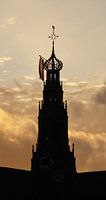 Dit is de toren van de Sint-Bavokerk of Grote Kerk in Haarlem, met de vlag van Nederland, in de schemering in het najaar van 2020.